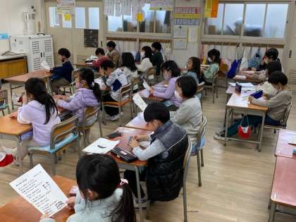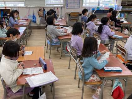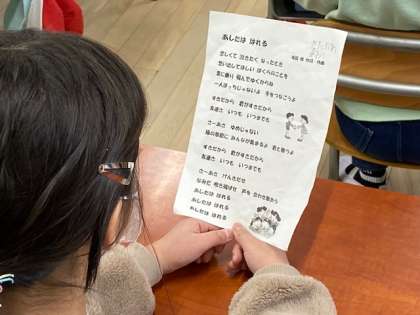 1年生の教室をのぞいてみると、「6年生を送る会」で歌う歌の練習をしていました。