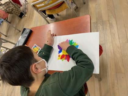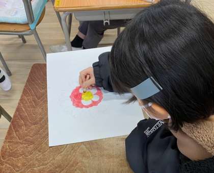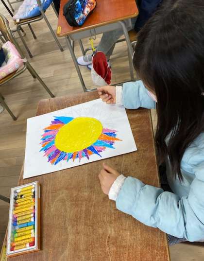 2年生は、6年生を送る会で「世界に一つだけの花」を歌うそうですが、まさに世界に一つだけの花をカラフルに描いていました。