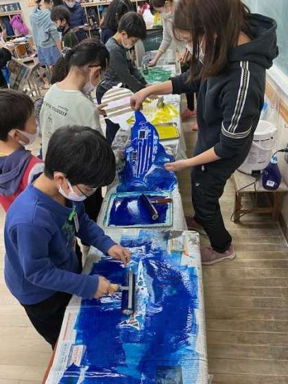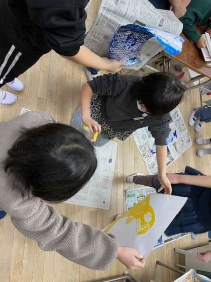 今日3年生は、紙版画に取り組みました。紙の裏には糸や網をつけ、魚のウロコなどの模様をつけていました。