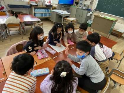1年生は、3月に予定されている大江幼稚園年長さんとの交流を前に、大江小学校の何を紹介するか、班で話し合っていました。