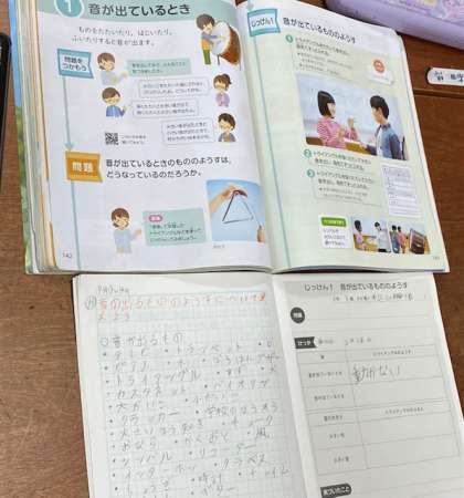 今日の3年生の理科では、音が出る時の様子を調べていました。