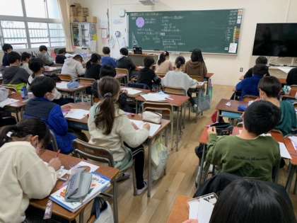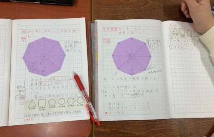 今日から『多角形と円をくわしく調べよう』の学習にはいりました。今日は、折り紙で作った八角形の角の大きさや、辺の長さをはかり、気づいたことをノートにまとめ発表し合いました。