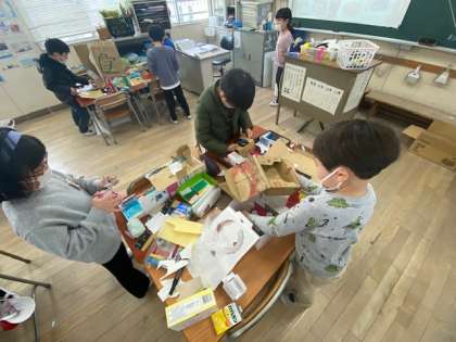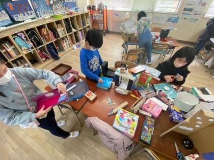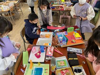 2年生の図工では「ともだちハウス」を作っていました。子どもたちに近づくと「ここで友だちが集まってが遊ぶねん」とか「テレビがここにもそこにもあるねん」とか「ここを渡って次のビルに行くねん」などいろいろな話が出てきます。