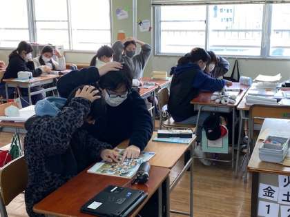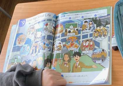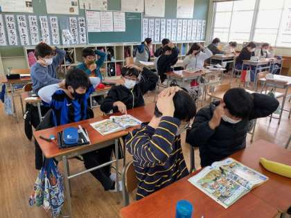 授業の後半は、手を頭の上に置いてセットし、先生が言った部活動指で押さえると言うゲームをしながらと活動を英語で表現することを体験的に学んでいました。