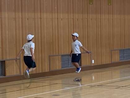 2年生の体育では、い組とは組が運動場でキックベースボールを、ろ組は体育館で縄跳びをしていました。