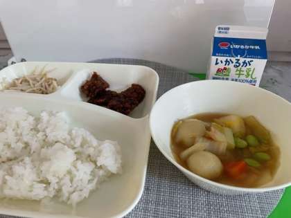くじらのオーロラ煮、まる天と野菜のうま煮、もやしのピリ辛あえ