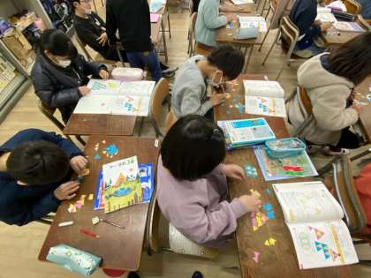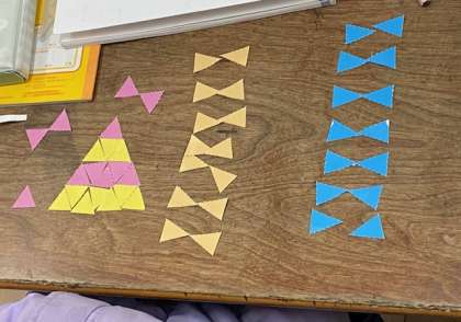 3年生の算数では、与えられた三角形を組み合わせて大きな正三角形を作ったり、二等辺三角形を作ったりしていました。