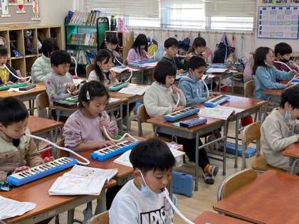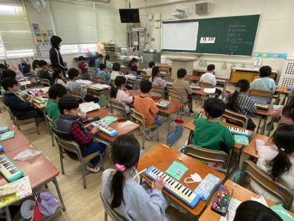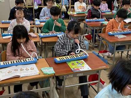 1年生の音楽では、「がっこうへいこう」を元気に歌ったあと、鍵盤ハーモニカに取り組みました。息を吹くところ息を止めるところ、吹き方によって音の出方が変わることを感じていました。