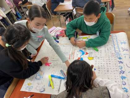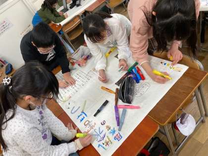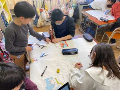 5年生の総合では、地震や津波、風水害などについて調べたことを壁新聞にしようということで、グループで力合わせて作業していました。