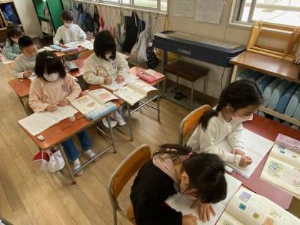 1年生の教室では、国語「ことばのひろば」で学習したことをもとに「が、を、で」のつく短文を考えていました。