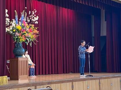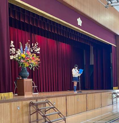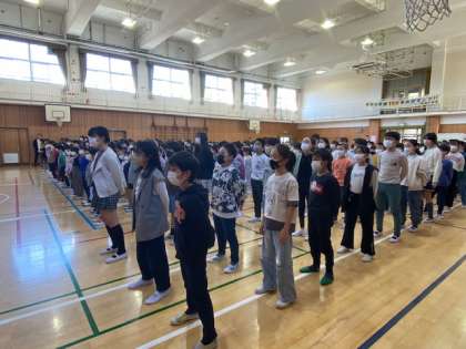 朝、令和5年度の始業式が行われ、転入生の紹介、新しく来られた教職員の紹介、校長先生のお話、担任発表と続き、児童代表として6年生が今年の決意を述べました。
