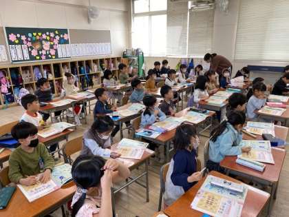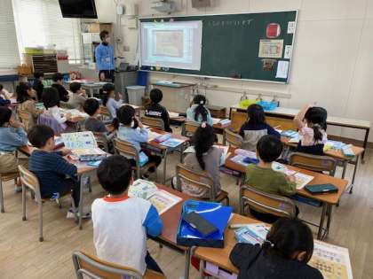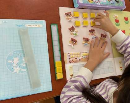 1年生の算数では、『なかまづくりとかず』ということで、同じ仲間のものを線で結んだり、ブロックを置いたりして、数を数えていました。