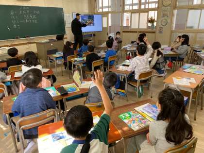 これから学んでいく大阪市の様々な事について、クイズ形式で出題され、子どもたちが楽しみながら答えていました。