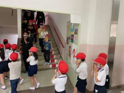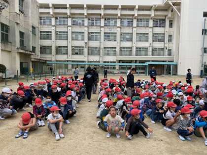 今年度最初の避難訓練でした。子どもたちは、ハンカチを口に当てて素早く避難することができました。
