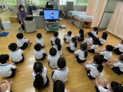 始めに、保健室の先生から利用の仕方や注意事項についての話があり、続いて身長・体重の測り方を教えてもらいました。
