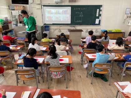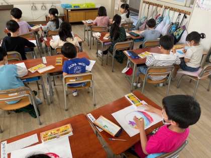 本日の1年生の図工では「にこにこたいようおひさまの絵」をテーマに描いていきました。