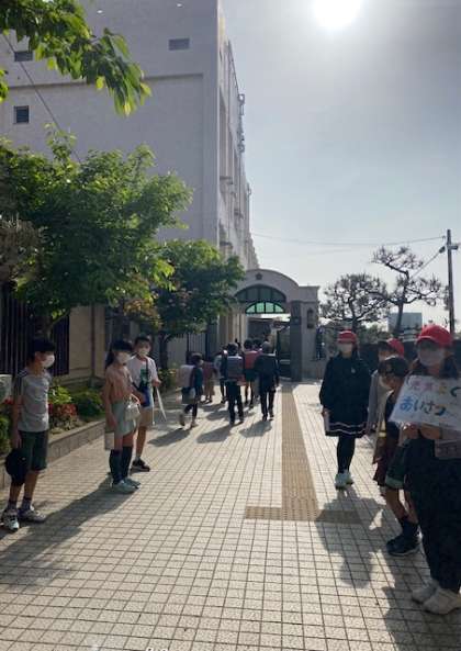 あいさつ運動をしている運営委員の子たちも、帽子をかぶったり水筒を持ってきたり、暑さ対策をして取り組んでいます。