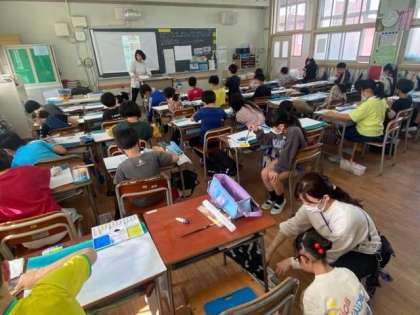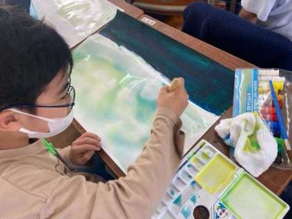 本日の4年生の図画工作は、「エルマーのぼうけん」の背景を塗りました。前回は海を塗り、本日は空を塗りました。セルリアンブルーとレモンの絵の具の量を調整しながら、それぞれ好きな色をつくっていました。