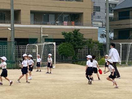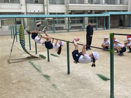 鉄棒、コンビネーション遊具、肋木(ろくぼく)と、「できることからでいいよ」と担任の先生が声をかけます。安全で安心して取り組んでいくことがベースです。