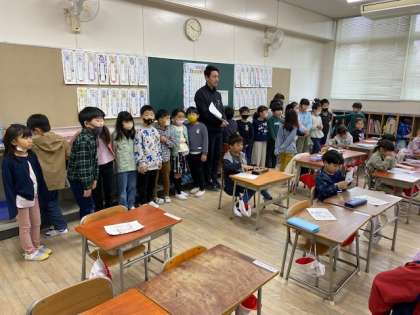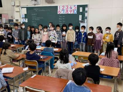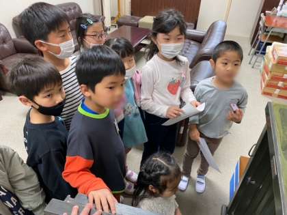 1年生の教室では、始めのあいさつをした後、グループに分かれて校長室や職員室、保健室や給食室などいろいろな部屋を回りました。
