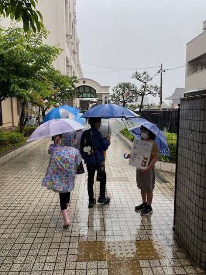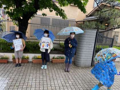 あいさつ運動をしている子どもたちも桜の木で雨をしのぎ、あいさつ運動をしていました。