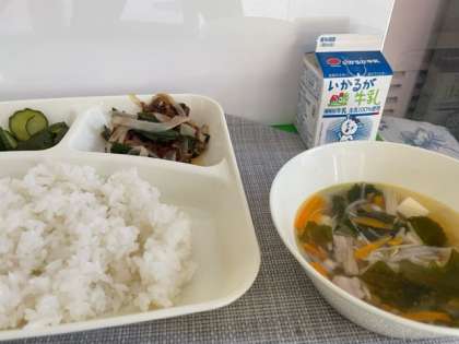 プルコギ、とうふとわかめのスープ、きゅうりの甘酢づけ
