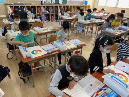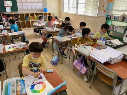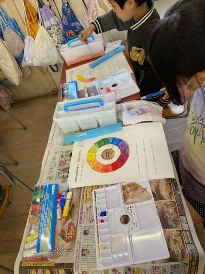 3年生の図工では、『3原色の絵の具を使って色を作り出そう』ということで、変化する色を楽しんでいました。