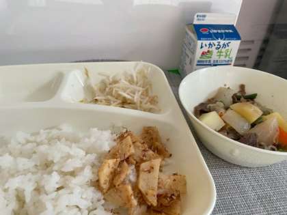 肉じゃが、もやしのゆずの香あえ、ごまかかいため