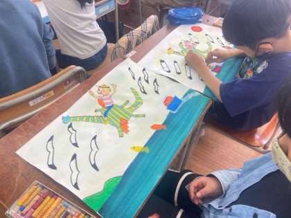 エルマーとりゅうをハサミで切って空に貼り、まわりにはカモメや夕日、山をパスで丁寧に描くことができました。海には船や魚を描き、個性が溢れる素敵な「エルマーのぼうけん」が完成しました(^^)