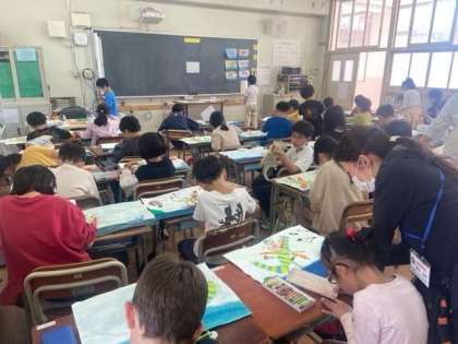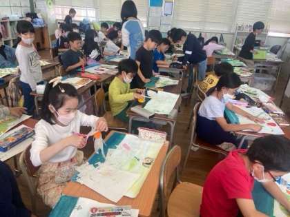本日の4年生の図画工作は、「エルマーのぼうけん」の空や海の様子を描きました。