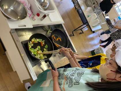 これまでの経験を生かして、整然と調理器具を取ってきたり、野菜を切り、野菜を炒め、味付けをして完成させるという手順をイメージしたりして手際よく調理していました。