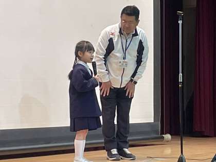 今日の児童朝会では、転入生を迎えましたので、自己紹介をしてもらいました。しっかりあいさつができました(^^)