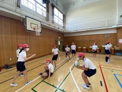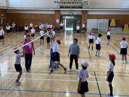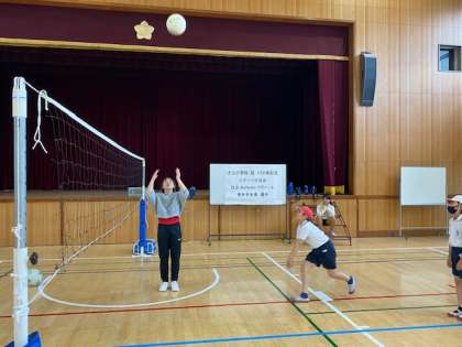 6年生の体育も、今日のスペシャルゲスト・Vリーグの徳本歩未香選手からバレーボールの基本を教えていただきました。