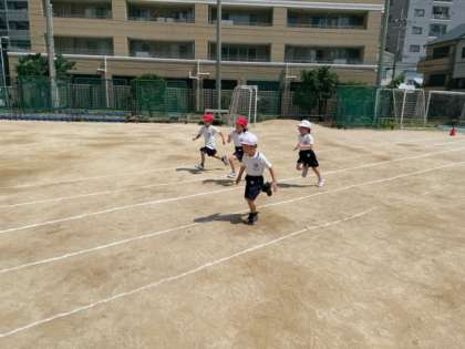 子どもたちは、先生のアドバイスをよく聞きながら、どんどん走るコツを掴んでいました。また色々なゲームを通して体を動かす楽しさを味わっていました(^^)