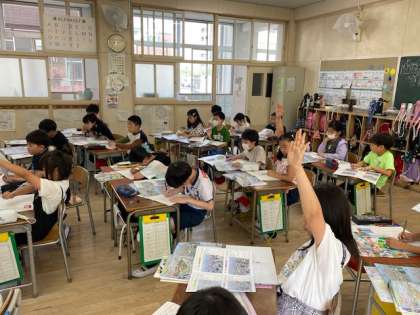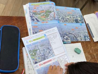 3年生の社会科では、今週始めに社会見学で行った『あべのハルカスの展望フロア』で発見してきた大阪のまちの様子について発表していました。