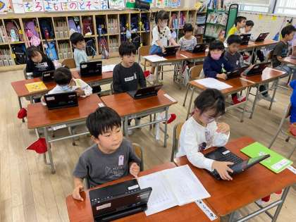 1年生の教室を覗いてみると、学習者用端末を触っているところでした。