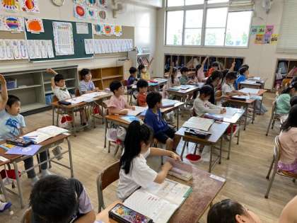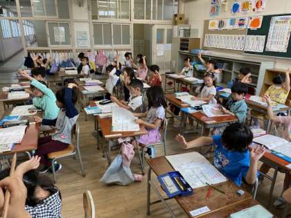 とても元気に手を挙げていた子、手を挙げていない子、それぞれいましたが、「練習問題できましたか?」の呼びかけにほとんどの子の手が挙がっていました(^^)