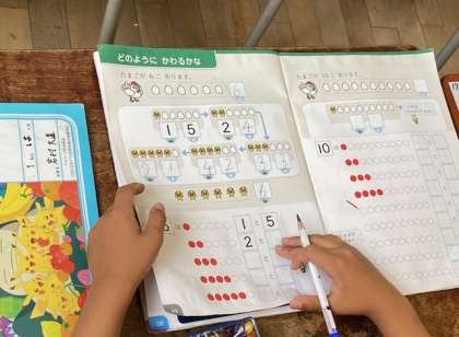 1年生の算数では、足して6になる数字について考えていました。