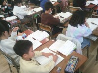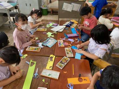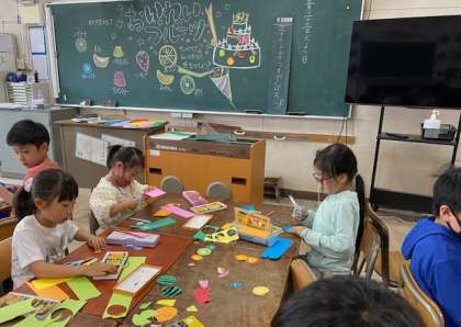 2年生の教室を覗いてみると、6/2に行う大江小学校150歳お祝いの会で使う巨大バースデーケーキのデコレーション部分にあたるフルーツの絵を描いていました。