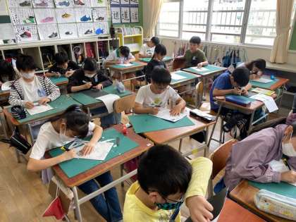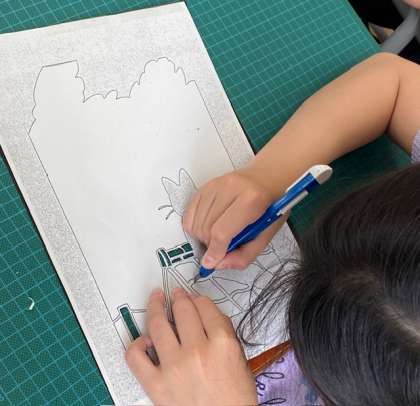 カッターナイフで曲線を切るのは大変難しいことですが、子どもたちは慎重にカッターを進ませ、また用紙を回転させて、集中して切っていました。