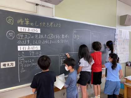 4年生の算数では、『暗算の仕方を考えよう』とのめあてで、結果を導き出すこと以上に、計算の途中、自分が考えたことを表すことを大事に学習をしていました。