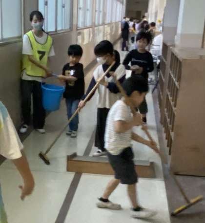 今日は1年生から6年生までで構成する『なかよし班』で清掃を行いました。上学年の子たちが下学年の子たちに丁寧に掃除の仕方を教えたり、協力したりして掃除をしていました。