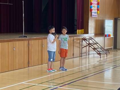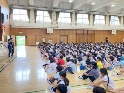 今朝の児童朝会では、まず校長先生から『水無月』についてのお話のあと、雨の日の楽しみ方を見つけて安全に楽しくすごしましょう、と呼びかけられました。