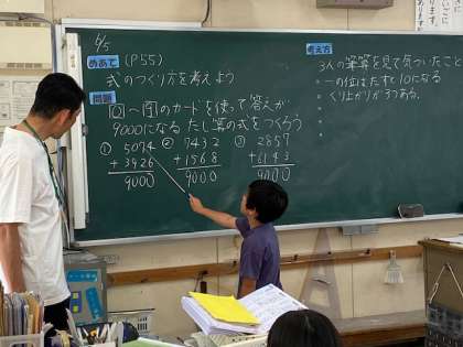 3年生の算数では、『式の作り方を考えよう』ということで、0から9までの数字を使って2種類の4桁の数字を作ります。作った数字を足して9000になるようにするためには、0から9をどのように並べたら良いでしょうか。