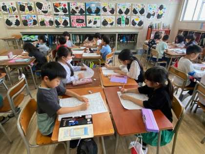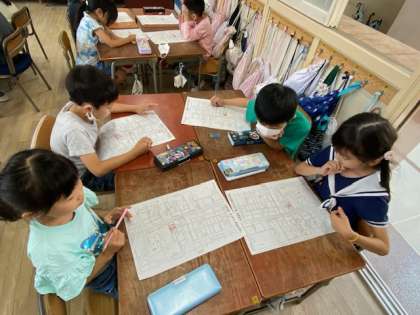 子どもたちは学校に戻ってきて、早速、校区地図に発見したことを書いていました。