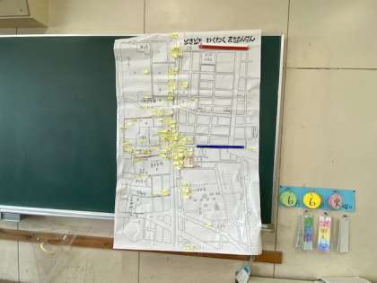 黒板に貼られた、大きな大江小学校区の地図には、発見したことが書かれたたくさんの付箋が貼られていました。
