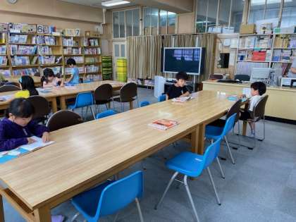 図書室には子どもたちが思わず読みたくなる本がいっぱい。1年生も興味のある本を取ってじっくり読んでいました。