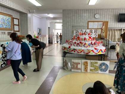 玄関には、6月2日のお誕生日お祝い集会で披露したビックバースデーケーキもお披露目しました。
