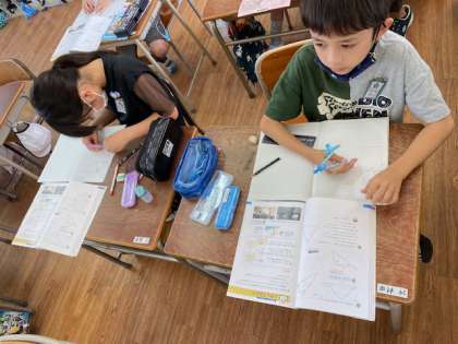 4年生の算数では、三角形の作図に取り組んでいました。はじめに1辺の長さを測って線を引き、コンパスを使って頂点の位置を決めていきます。