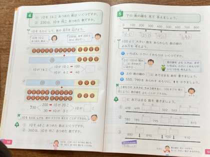 特に360 は10がいくつ集まった数だろうとの問いかけに、説明の仕方まで考えて理解していました。